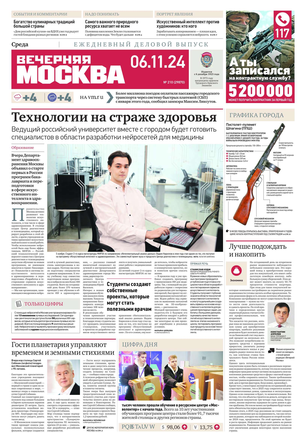 «Вечерняя Москва» — ежедневная российская вечерняя газета, старейшее из вечерних изданий в России, учрежденное в 1923 году. Выходит пять дней в неделю, кроме субботы и воскресенья. Отличается тем, что рассказывает о событиях еще не завершившегося дня. Оперативно освещает хронику и особенности жизни Москвы, охватывает все слои общества и большинство профессиональных и возрастных групп читателей.Издание представлено тремя выпусками – утренним ежедневным, вечерним (выходит три раза в неделю), еженедельным (выходит по четвергам).